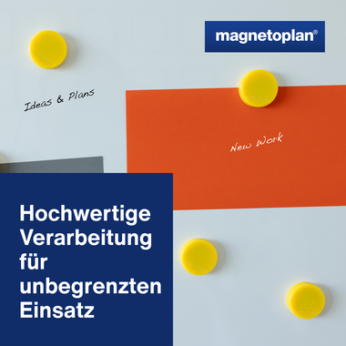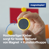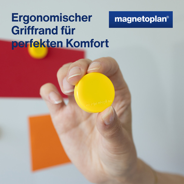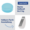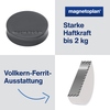 Die Ergo-Magnete mit ergonomischem Griffrand bieten perfekten Komfort in der Handhabung und lassen sich leicht von der Tafeloberfläche wieder abnehmen. Die spezialbeschichtete Magnet-Unterseite verhindert ein Zerkratzen der Oberfläche. Durch die Vollkern Ferrit-Ausstattung verfügen die Ergo-Magnete über für eine besonders hohe Haftkraft. Ein hochwertiger Kleber garantiert den festen Verbund mit den farbigen Kunststoffkappen.